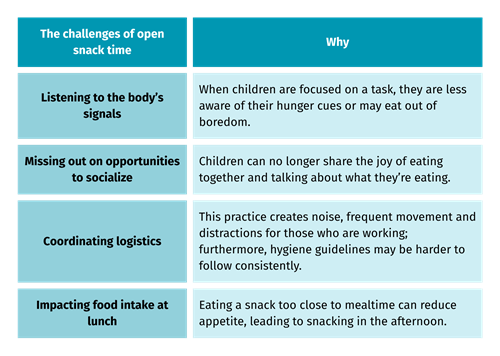 In some school settings, there is a trend toward an open snack time, where children can snack at a time of their choosing rather than setting aside a specific period for everyone to eat together. The intentions behind this approach are commendable: to foster autonomy and encourage children to listen to their hunger cues.